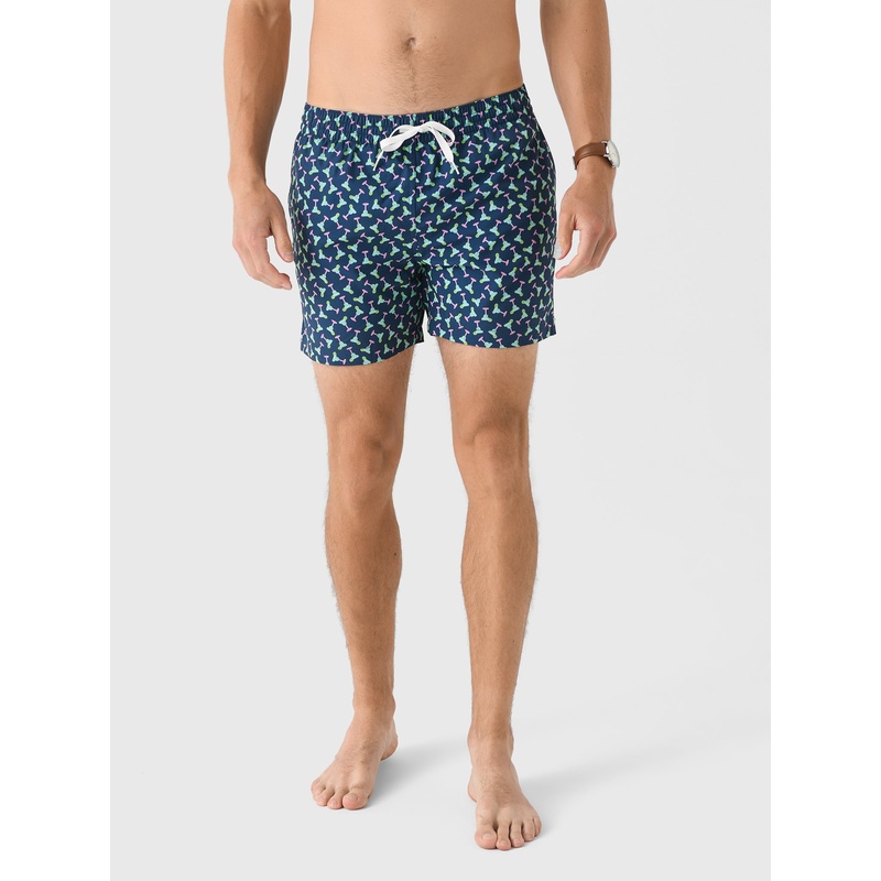 DESCRIPTION:This swim trunk features a playful, margarita glass print in shades of teal and pink against a navy background. It has a classic silhouette with a drawstring waistband and a mid-thigh cut.FEATURES:Elastic WaistbandAdjustable DrawstringSide Pock