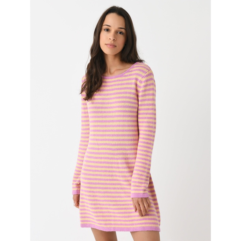 A striped knit mini dress featuring back cutout detailing.