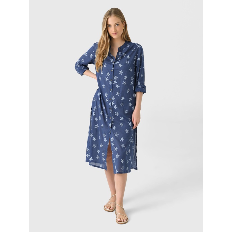 DESCRIPTION:A long and flowy dress made from lightweight cotton with a starfish print and a timeless silhouette.FEATURES:Round NecklineButton CuffsButton-Down FrontSplit HemMidi SilhouetteAll-Over Novelty Print100% CottonRelaxed FitModel is wearing size Sm