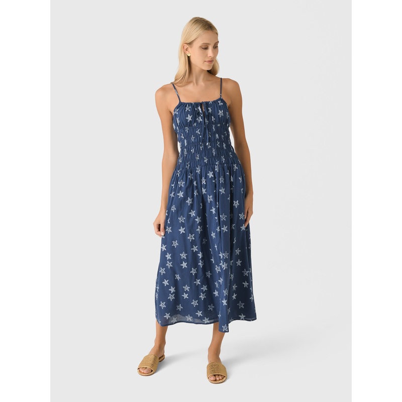 DESCRIPTION:A casual midi dress made from starfish-printed cotton voile with a smocked bodice and a keyhole tie at the neckline.FEATURES:Square NecklineSelf-Tie DetailThin, Fixed StrapsSmocked BodiceGathered SkirtMidi SilhouetteAll-Over Novelty Print100% C