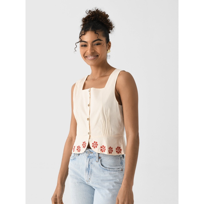 DESCRIPTION:This sleeveless top features delicate red floral embroidery along the hem, adding a touch of feminine charm. The square neckline and button-down front create a classic silhouette, while the subtle peplum adds a hint of volume.FEATURES:Square Ne