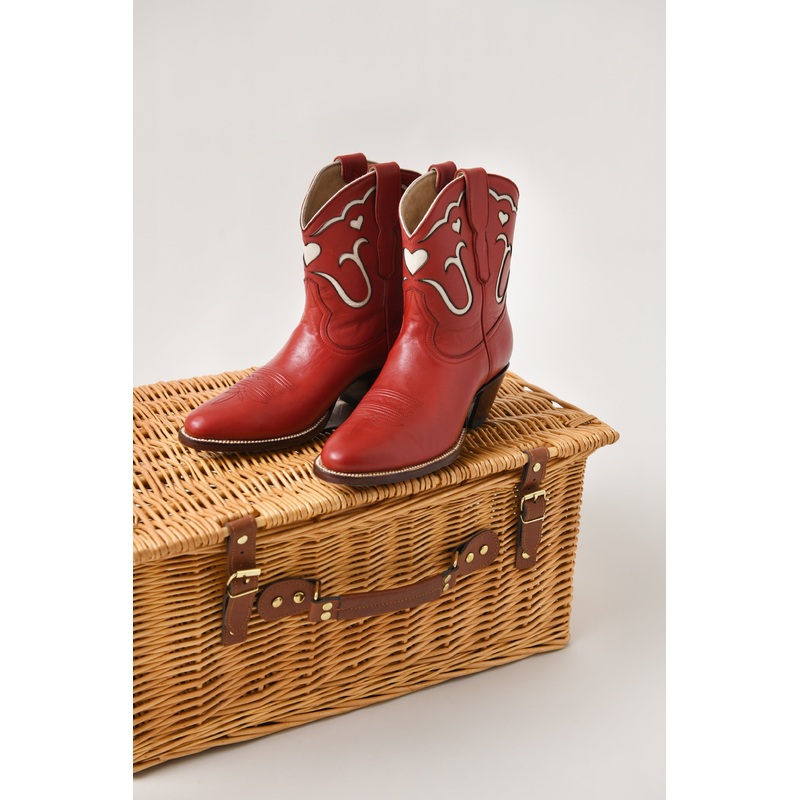 DESCRIPTION:A vibrant red boot with a short silhouette and contrasting white heart details.