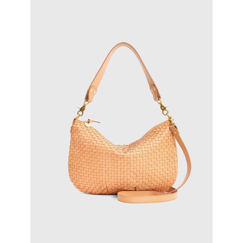 DESCRIPTION:A crescent-shaped bag made from handwoven leather with a carryall design that holds an iPad, water bottle, and sunnies.FEATURES:Zip ClosureInterior PocketChambray LiningWoven Exterior100% LeatherDimensions: 15 in. x 11 in. | Shoulder Strap: 21