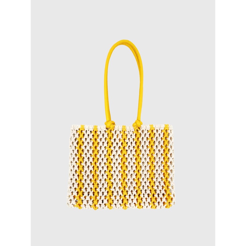 This vibrant and stylish tote is perfect for adding a pop of color to your look. It’s crafted with an open weave design featuring alternating stripes of natural ecru and sunny yellow for a breezy and summery aesthetic.