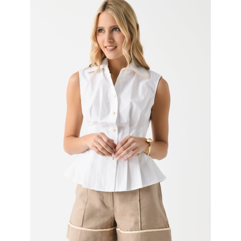 A sleeveless blouse made from crisp cotton featuring contrast collar piping and a peplum-style pleated hem.