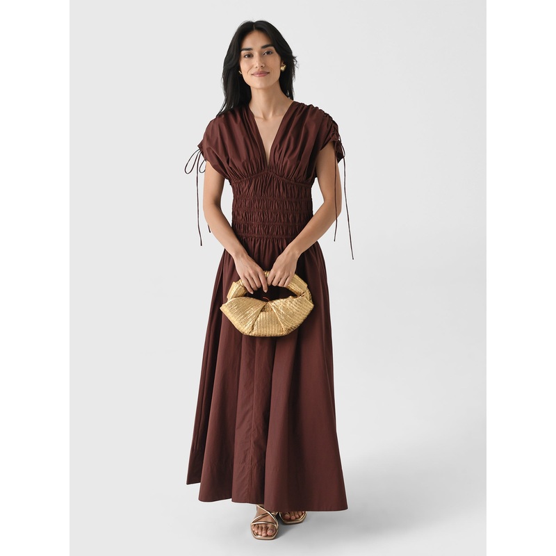DESCRIPTION:The Ottavia Midi Dress is crafted from crisp cotton and features a deep v-neckline and extended shoulders with adjustable ties. The fitted waist with shirring detail transitions into soft gathers at the high hip, flowing to the hem.FEATURES:V-N