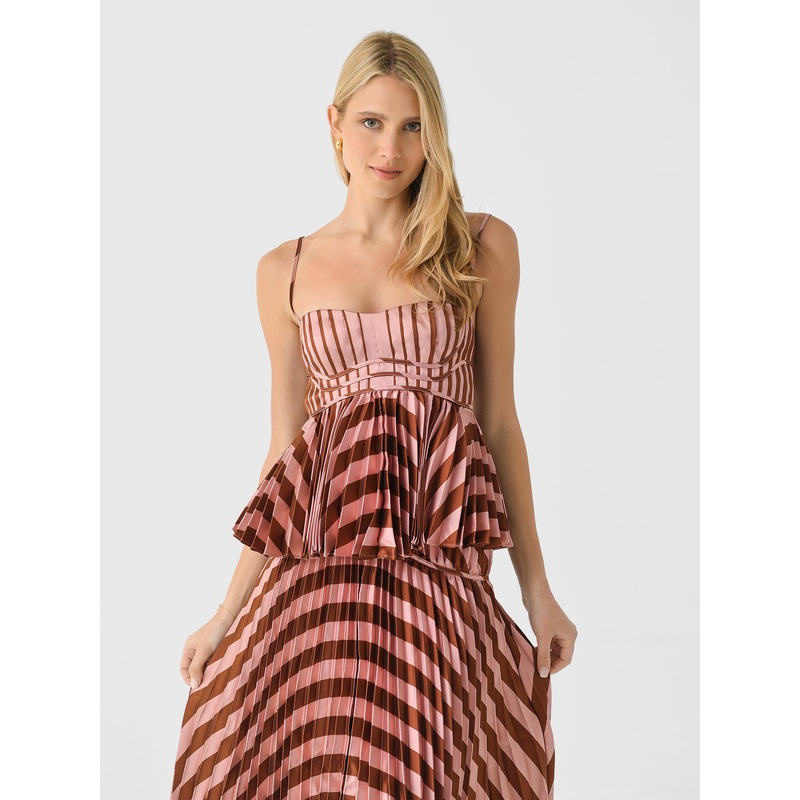 DESCRIPTION:This beautiful top features a pleated, two-tone design with a fitted bodice and flowing hem.FEATURES:Sweetheart NecklineThin, Adjustable StrapsBack Zip ClosureCinched WaistPleated HemAll-Over Stripe Print100% PolyesterClassic FitModel is wearin