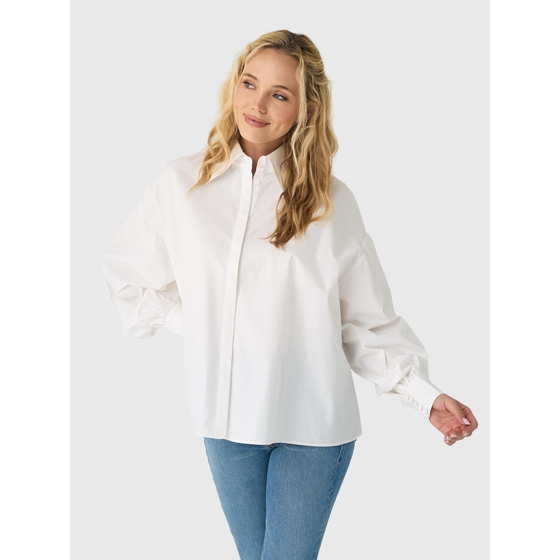 DESCRIPTION:This crisp button-down shirt is a modern take on a classic wardrobe essential. It's designed with a structured collar and a hidden placket for a clean, streamlined look. The shirt features voluminous balloon sleeves that are cinched at the wris