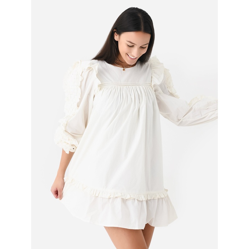 DESCRIPTION:Lightweight mini dress with woven detailing on the yoke and sleeves with ruffle trim and a flounce hem.FEATURES:Round NecklineRuffle ShouldersBack ClosureWoven DetailsFlounce Hem100% Organic CottonClassic FitModel is wearing size Small dress.Mo