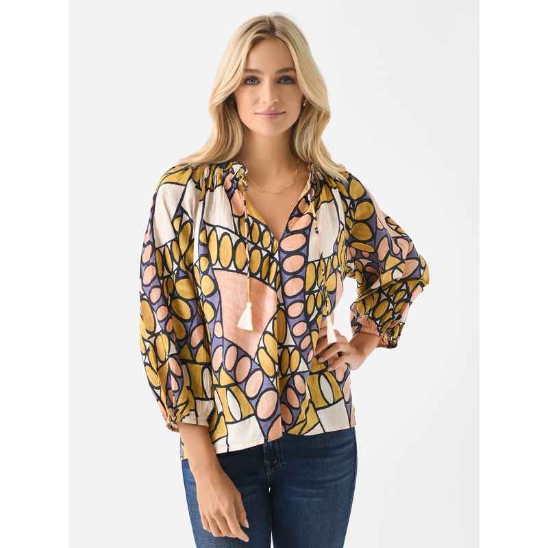 DESCRIPTION:An ethically handmade blouse made from lightweight organic cotton with a ruffle collar and rouleau tassel ties.FEATURES:Ruffle CollarSelf-Tie NecklinePuff SleevesAll-Over Novelty Print100% Organic Cotton VoileRelaxed FitModel is wearing size Sm