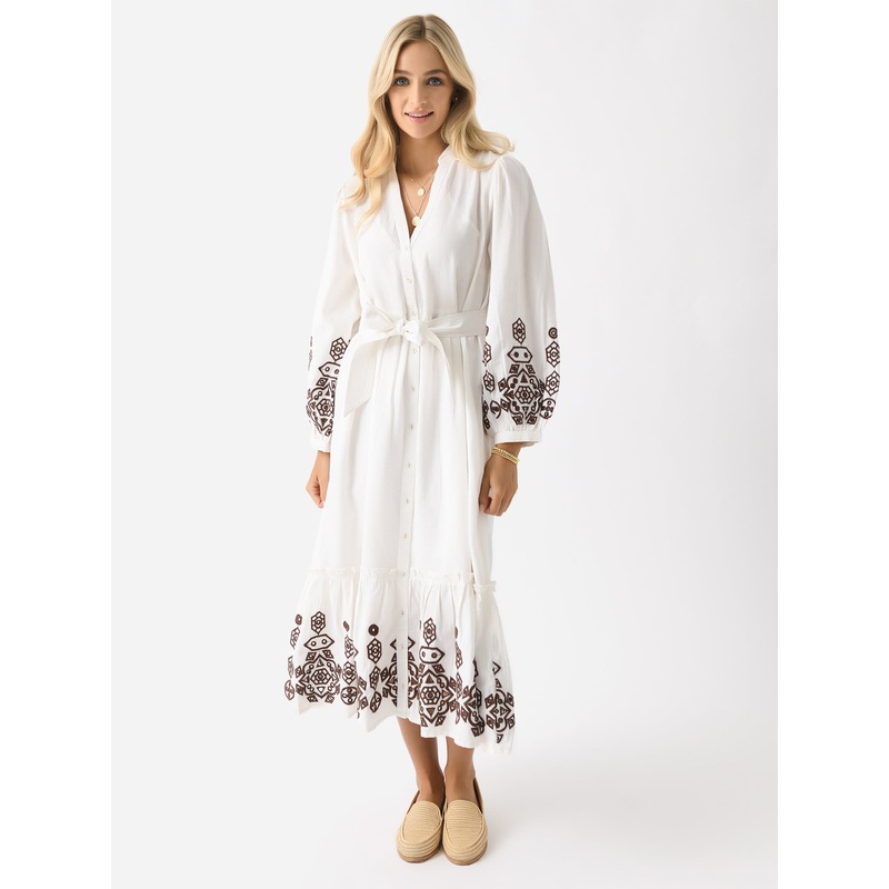 A mid-length shirtdress ethically made from a lightweight cotton and linen blend with contrast embroidered details and a self-tie belt for added shape.