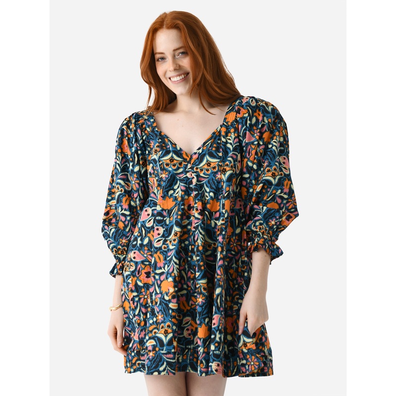 DESCRIPTION:A lightweight mini dress featuring a flattering neckline and an eye-catching colorful print.FEATURES:V-Neckline3/4 Length Puff SleevesSmocked CuffsBack Zip ClosureMini SilhouetteAll-Over Novelty Print100% Organic CottonClassic FitModel is weari