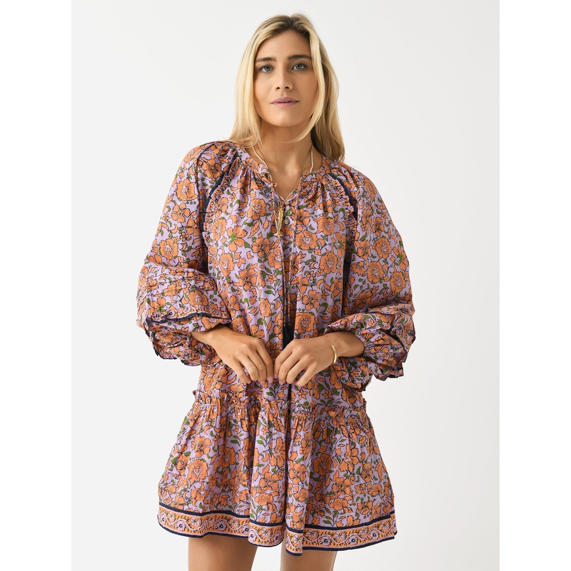 An airy mini dress with balloon sleeves and a custom print made from organic cotton.
