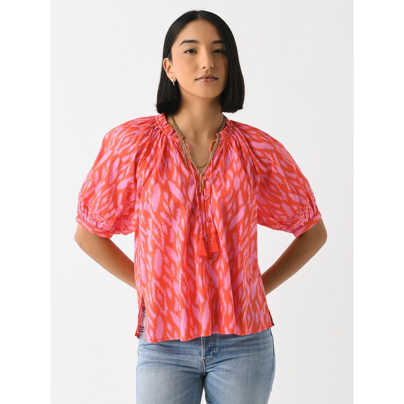 DESCRIPTION:A lightweight organic cotton voile blouse with half-length puff sleeves, tassel tie neckline, and custom ikat print.FEATURES:Ruffle CollarSelf-Tie NecklineHalf-Length Puff SleevesButton-Down FrontAll-Over Novelty Print100% Organic Cotton VoileR