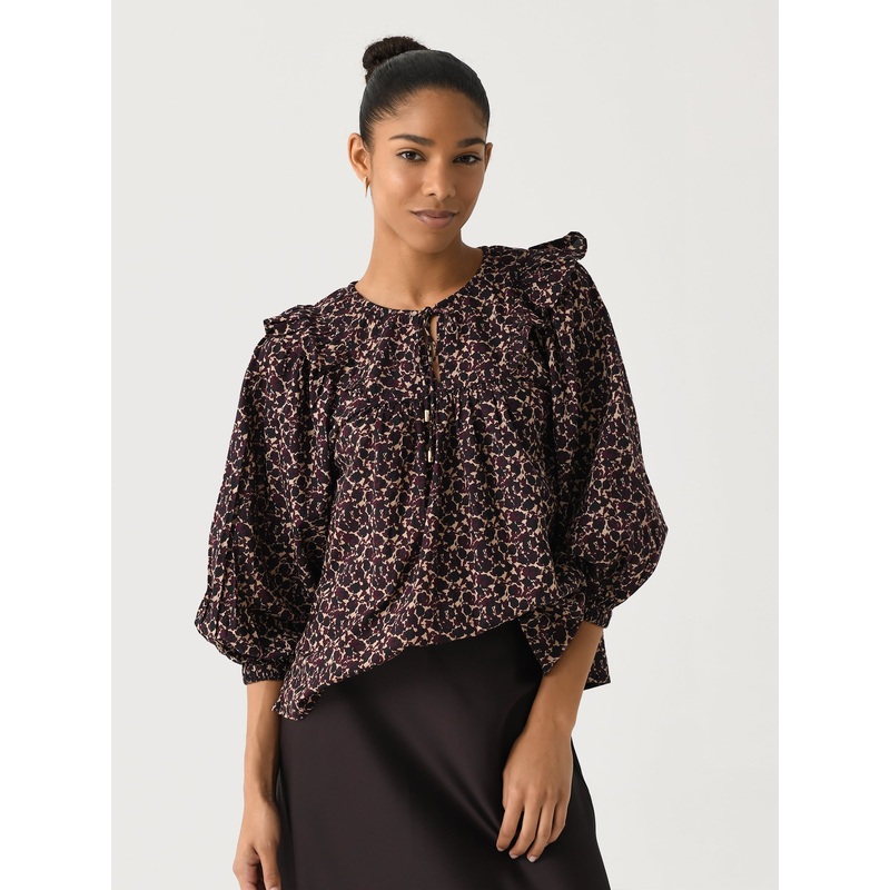 DESCRIPTION:A light and flowy blouse made from organic cotton with a self-tie neckline and blouson sleeves with ruffle-trimmed shoulders.FEATURES:Self-Tie NecklineRuffle ShoulderBlouson SleevesAll-Over Novelty Print100% Organic CottonRelaxed FitModel is we