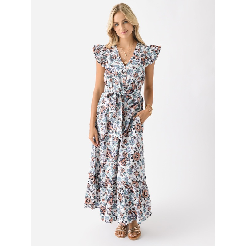 DESCRIPTION:An ankle-length dress featuring elegant ruffle sleeves, a self-tie belt, and a fun flounce hem.FEATURES:V-NecklineRuffle SleevesButton-Down FrontSelf-Tie BeltSide PocketsFlounce HemMaxi SilhouetteAll-Over Novelty Print100% Organic Cotton Poplin