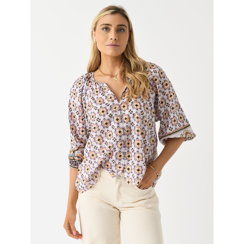 DESCRIPTION:An elegant blouse made from lightweight organic cotton with a beautiful custom print.FEATURES:V-Neckline3/4 Length Puff SleevesButton-Down FrontAll-Over Novelty Print100% Organic Cotton MulmulRelaxed FitModel is wearing size Small blouse.Model'
