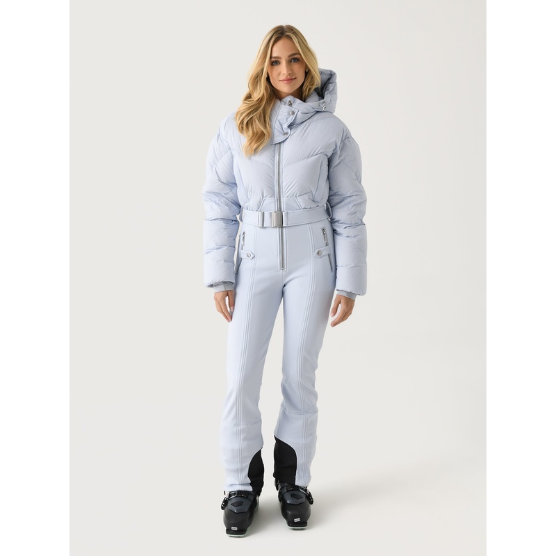 A stretchy softshell ski suit with a down-filled puffer-style bodice and classic ski pant bottom.