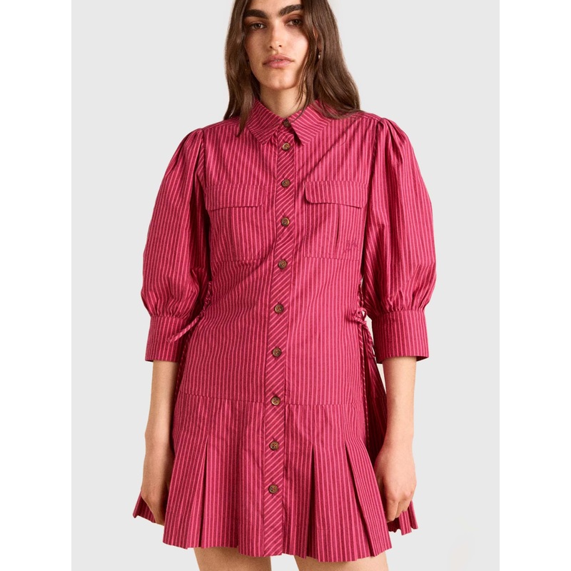 DESCRIPTION:The Maisie Mini Shirt Dress in Berry Business beautifully fuses masculine tailoring with feminine details. Crafted from organic cotton, it features a drop waist, pleated skirt, and functional ties at the waist for a flattering, chic look.FEATUR