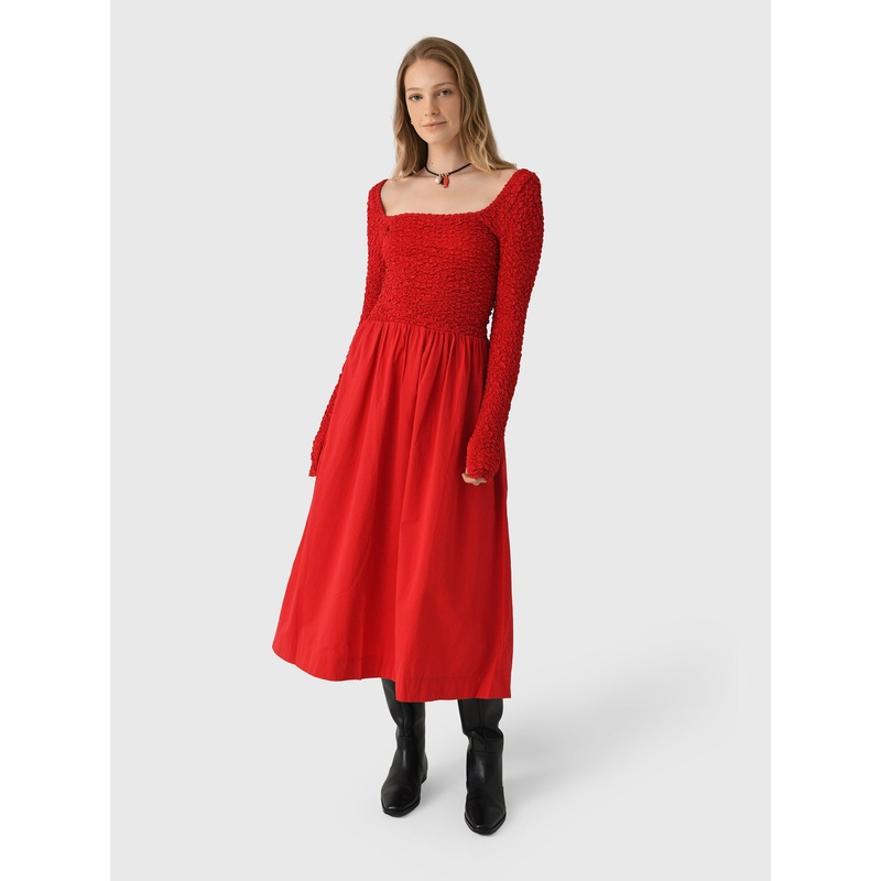 DESCRIPTION:This midi dress showcases a beautifully smocked bodice and sleeves, adding gentle structure to its graceful silhouette. A square neckline elegantly highlights the collarbones, while a delicate back tie offers a feminine touch. With its long sle