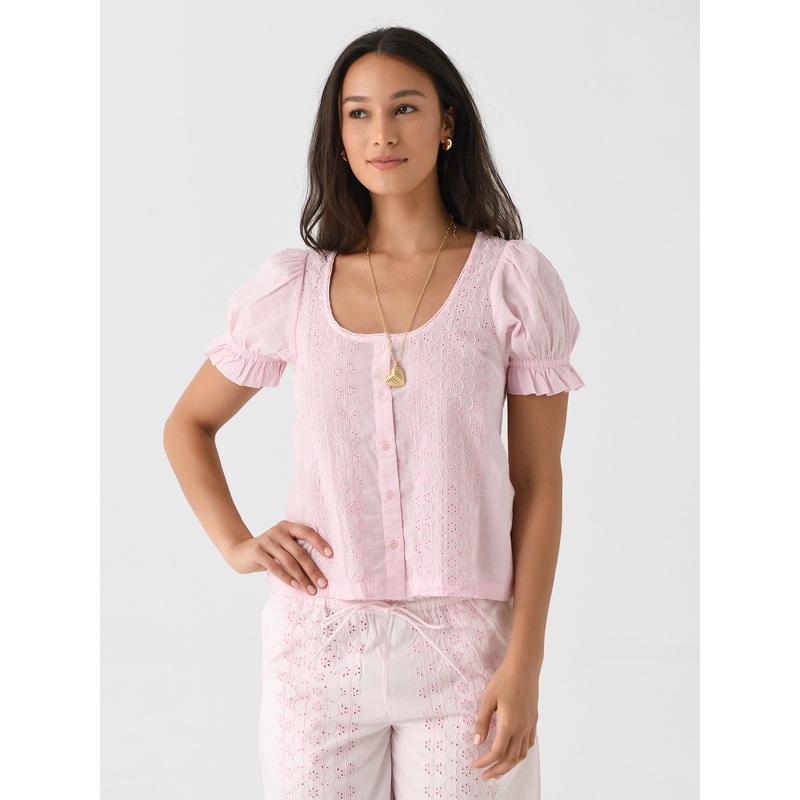 DESCRIPTION:This feminine blouse is made from lightweight organic cotton and features ruffle-trimmed cuffs and embroidered eyelet details.FEATURES:Scoop NecklinePuff SleevesRuffle TrimButton-Down FrontEmbroidered Eyelet Details100% Organic CottonClassic Fi