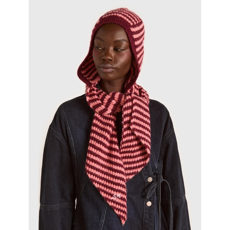 Crafted from wool, this striped knit hood offers versatile styling options. It can be worn as a hood, tied at the front, or wrapped as a scarf.