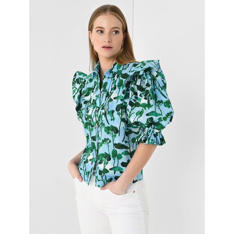 DESCRIPTION:A button-down blouse featuring pintucks, puff sleeves, and a stylish print made from lightweight cotton.FEATURES:Spread CollarShoulder RuffleHalf-Length Puff SleevesRuffle CuffsPintucked BibButton-Down FrontStraight HemAll-Over Novelty Print100