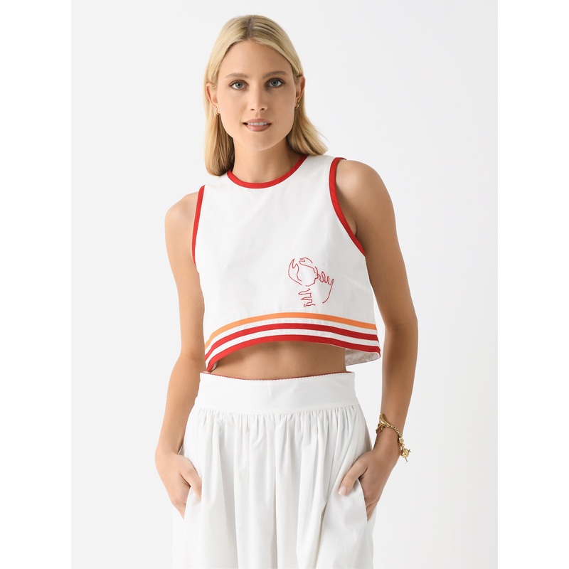 DESCRIPTION:A slightly cropped top made from lightweight cotton with contrast trims and an embroidered motif.FEATURES:Round NecklineBack Keyhole Button ClosureEmbroidered DesignContrast TrimsCropped Silhouette100% CottonClassic FitModel is wearing size Sma