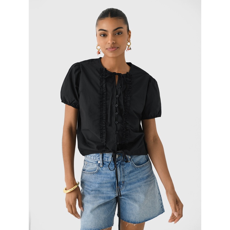 DESCRIPTION:This elevated everyday blouse features a flattering v-neckline with a button-down front, charming fixed ruffle details, soft blouson sleeves, and stylish gathered elastic cuffs.FEATURES:Self-Tie NecklinePuff SleevesButton-Down FrontRuffle Detai