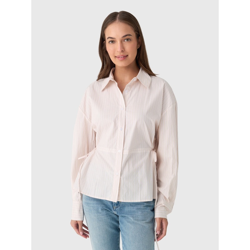 This structured shirt features a button front, wide-set shoulders, and a soft spread collar. The shirt is finished with design line seam details, cuff button accents, and a drawcord waist for an adjustable shape.
