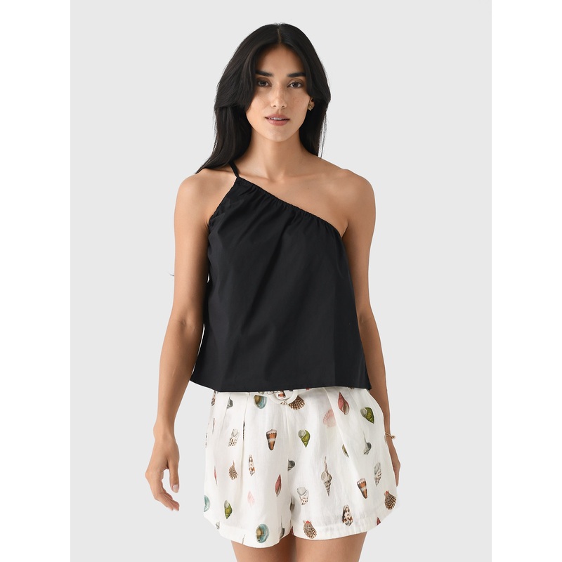 This lightweight one-shoulder top features a delicate fine tie shoulder strap and fixed gathering at the armholes. It’s designed with an elasticized neckline for a comfortable fit.