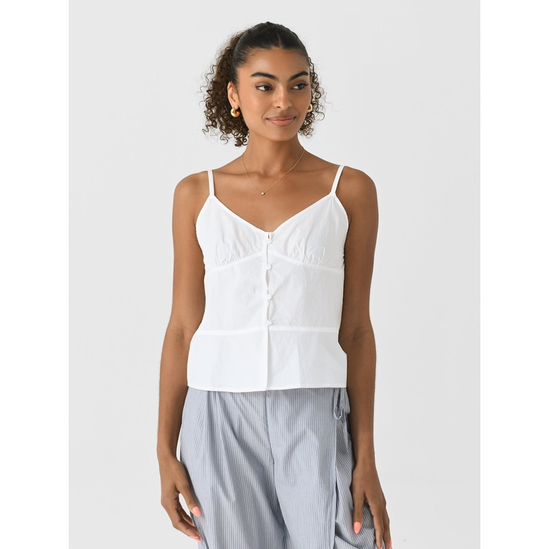 DESCRIPTION:A soft, structured top with a subtle flared silhouette. It features a button-front opening, slight bust gathers, and adjustable straps for a comfortable, flattering fit.FEATURES:V-NecklineThin, Adjustable StrapsButton-Down FrontSeam Details100%