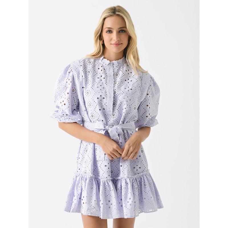 DESCRIPTION:A lightweight mini dress constructed from delicate eyelet lace with a self-tie belt and flounce hem.FEATURES:Round NecklineHidden PlacketSelf-Tie BeltFlounce HemMini SilhouetteAll-Over Stripe PrintEyelet Lace Fabrication100% CottonClassic FitMo