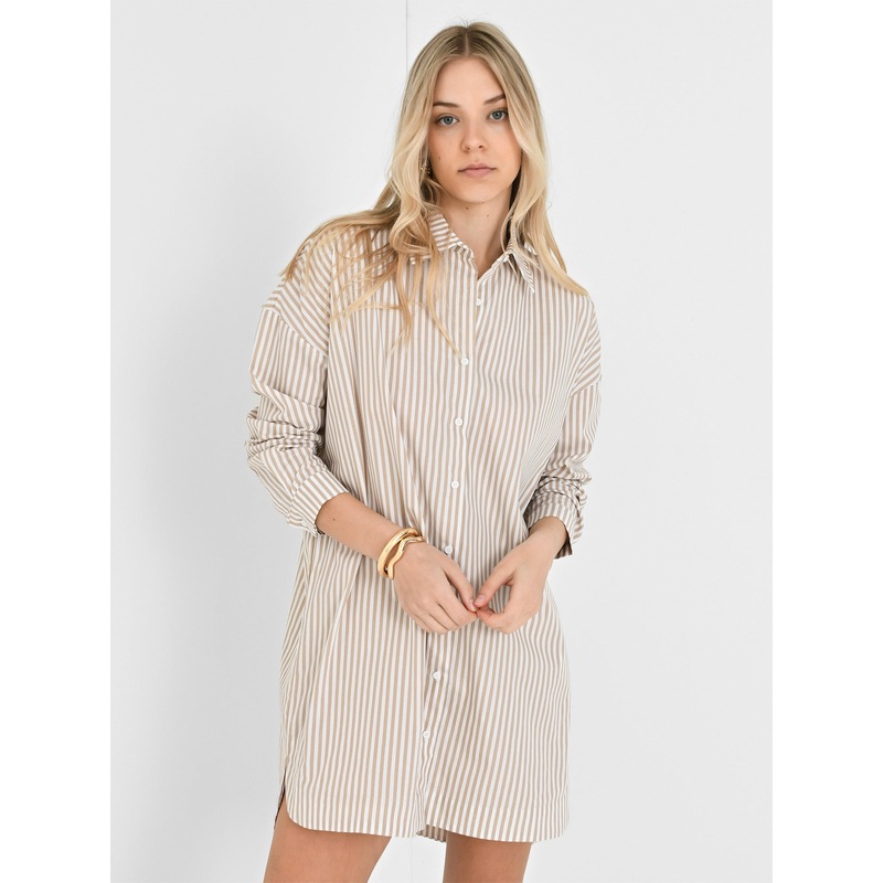 A mini shirt-style dress made from lightweight fabric with a striped print.