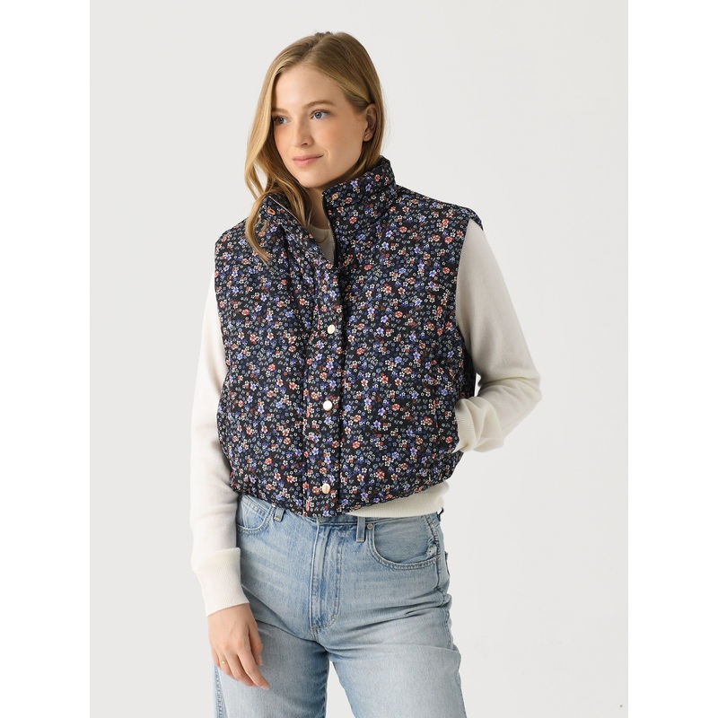 A must-have puffer vest with lightweight insulation and a ditsy floral print.