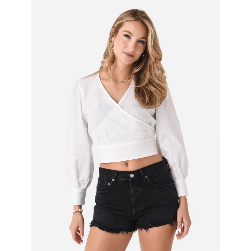 Lightweight top with puff sleeves, a self-tie hem detail, and a wrap silhouette.