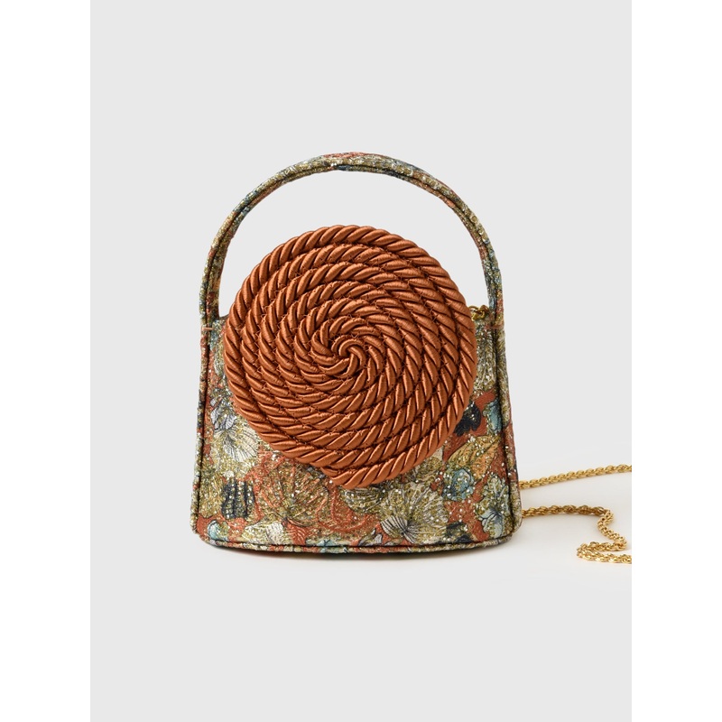 A mini handbag with an optional gold chain and tonal passementerie detail inspired by French craftsmanship and geometric designs.