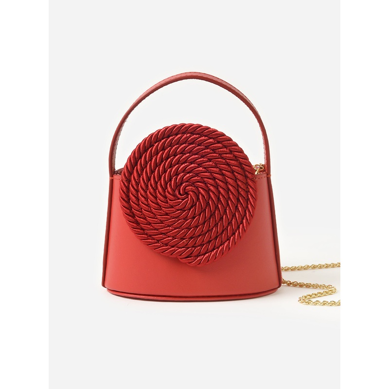 A bright red leather handbag featuring a removable strap and a tonal passementerie design.