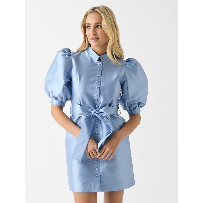 DESCRIPTION:A satin mini dress with half-length puff sleeves and a streamlined button-down front with a cinched waist.FEATURES:Mandarin CollarHalf-Length Puff SleevesButton-Down FrontSelf-Tie BeltFront PocketsMini Silhouette85% Polyester, 15% SilkClassic F
