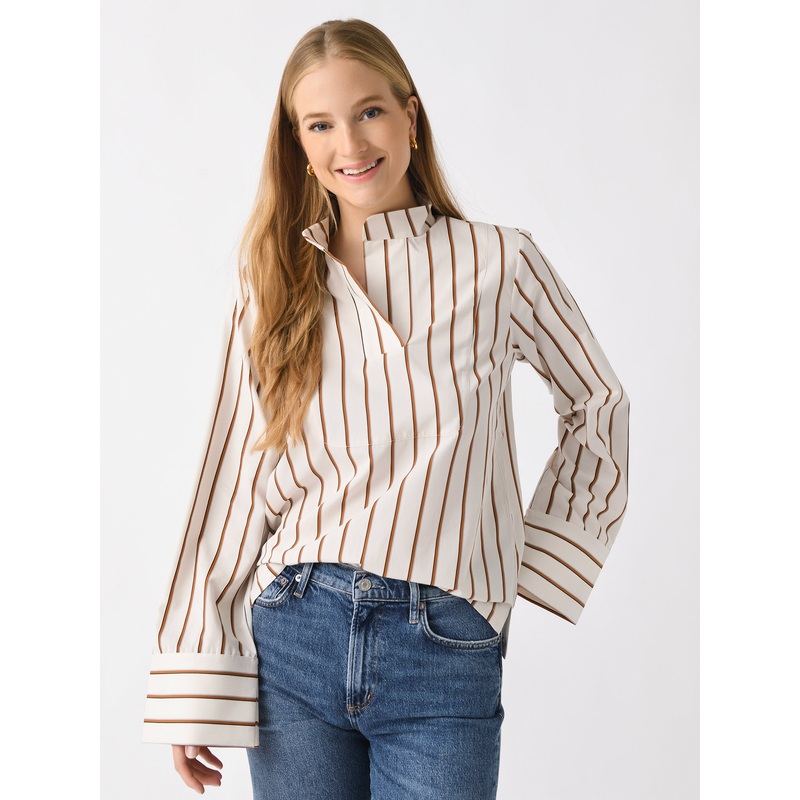 An oversized striped shirt featuring a high band collar, split neckline, and long wide sleeves.