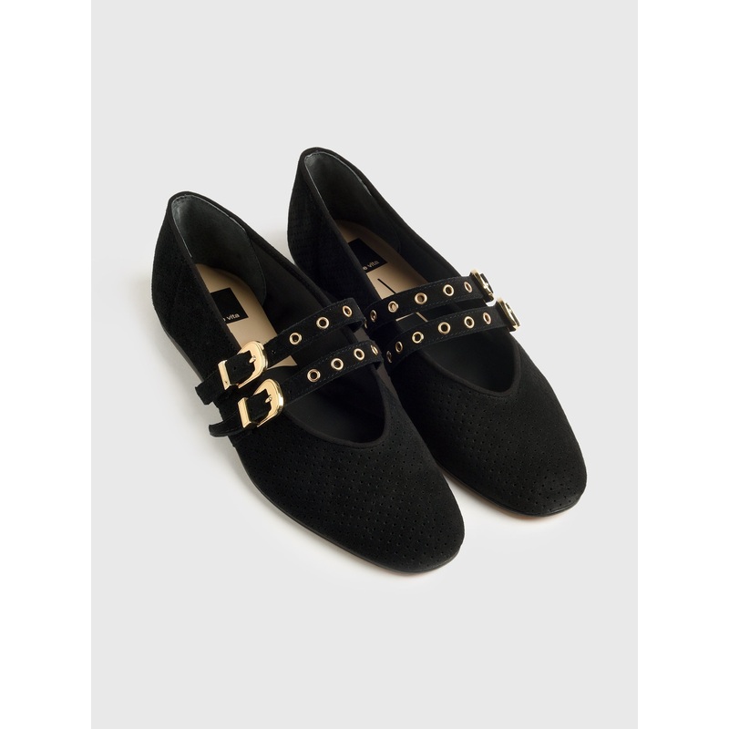 DESCRIPTION:With a double-strap mary-jane design, the Baylee Grommet Flat makes a statement. It's crafted from perforated leather and features bold buckles and gold-toned grommets.FEATURES:Round ToeAdjustable StrapsGold-Toned HardwareSuede & Textile Perfor