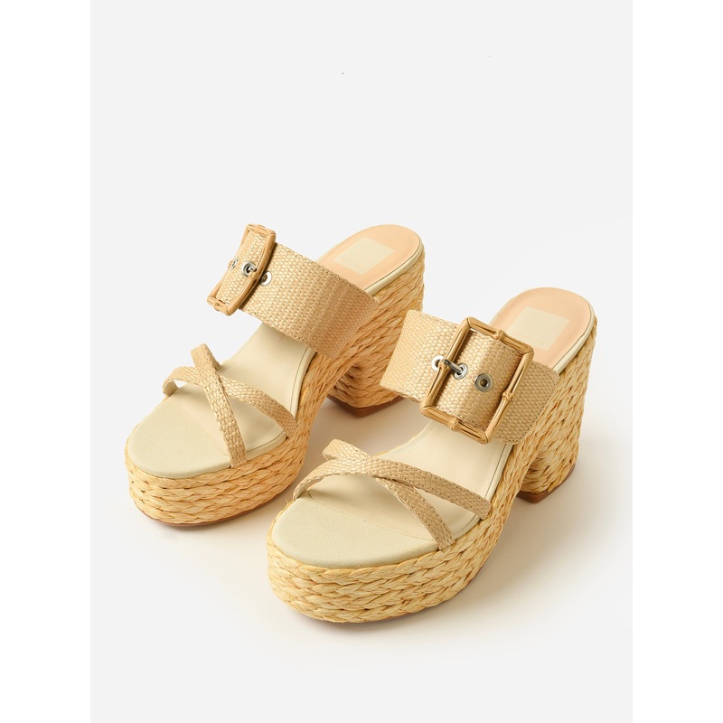DESCRIPTION:A chunky platform sandal covered in braided raffia and finished with a bamboo buckle.FEATURES:Raffia UpperCriss-Cross StrapsWide Buckle StrapRound ToeSynthetic LiningRubber OutsoleHeel Height: 4 in.Platform Height: 1.6 in.