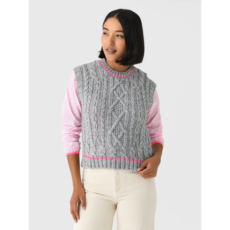 DESCRIPTION:This sweater vest features a straight cut, a round neck, and a contrasting fluorescent detail on the collar and hem. It's ideal for layering and adding a fun, special touch to your outfit.FEATURES:Crew NecklineContrast StitchingRibbed Neckline