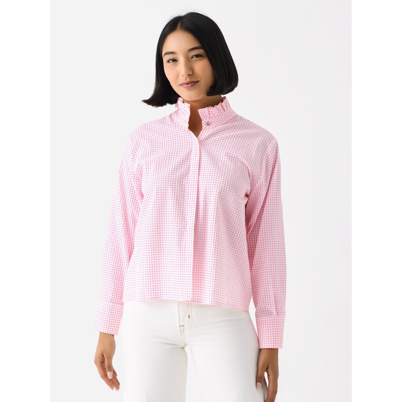 A lightweight cotton shirt with a micro square print and a ruffle collar.
