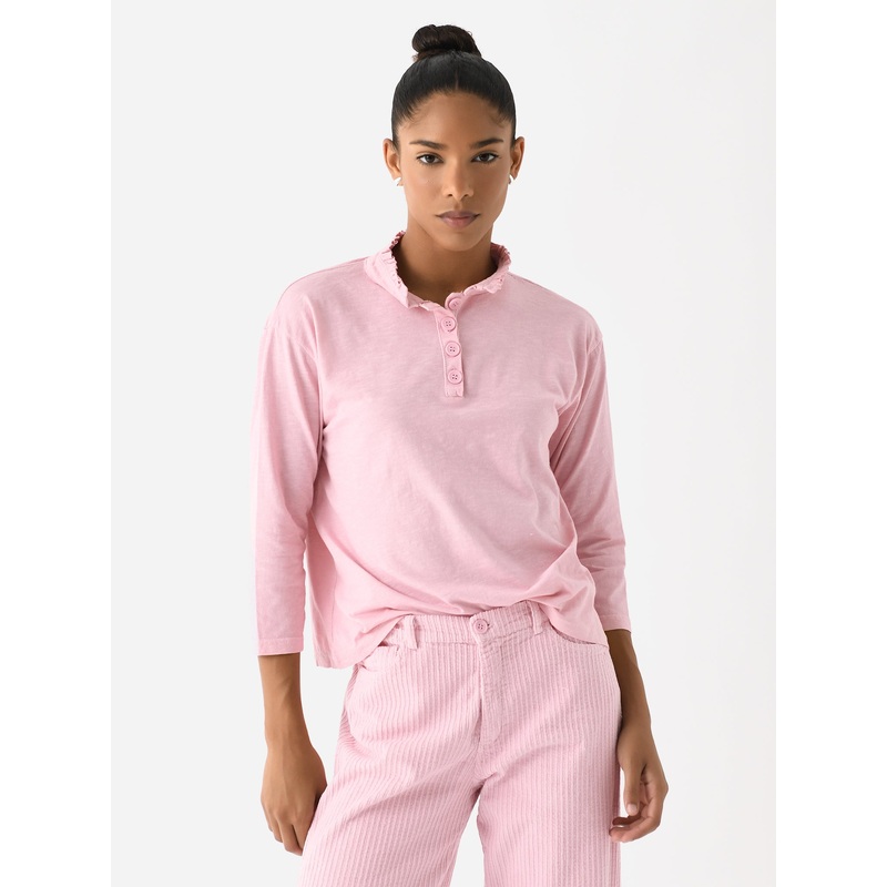 A lightweight cotton tee with a ruffle-trimmed neckline, henley placket, and 3/4 length sleeves.