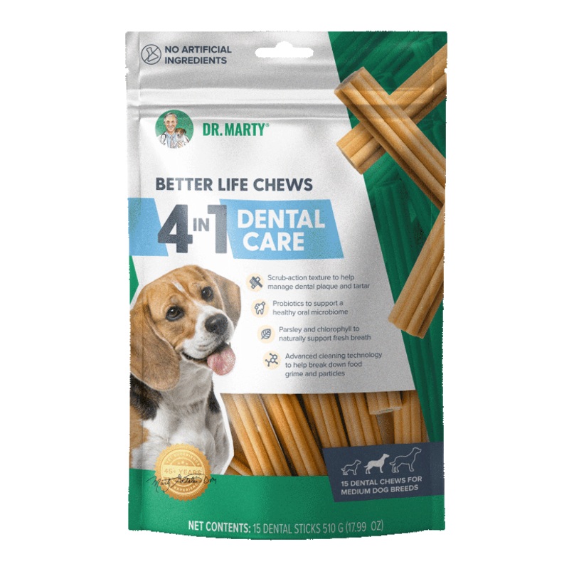Dr Marty Better Life Chews 4-in-1 Dental CareOur 4-in-1 Dental Care Chews are the easiest way to rapidly freshen your dogs breath and help their teeth shine. These advanced probiotic chews help fight plaque-causing bacteria, while micro-scrubbing enzymes l