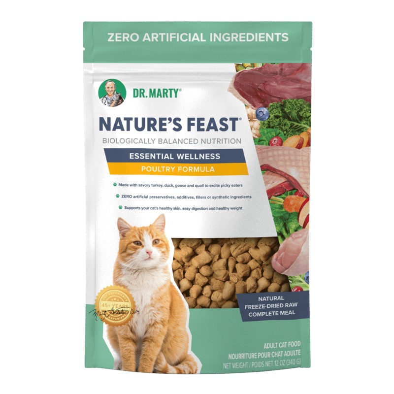 Dr Marty Cat Natures Feast Essential Wellness PoultryPremium Freeze-Dried Raw Cat FoodDr. Marty Natures Feast Essential Wellness Poultry is a premium freeze-dried raw cat food designed to support your cats healthy teeth and skin, easy digestion, youthful e