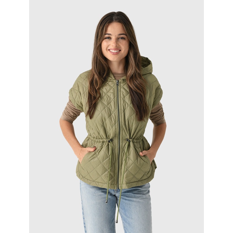 DESCRIPTION:This quilted vest is designed with an attached hood, cap sleeves, and an adjustable drawstring waist for a flattering, customizable fit. Finished with side pockets, its a versatile layering piece perfect for transitional weather.FEATURES:Attach