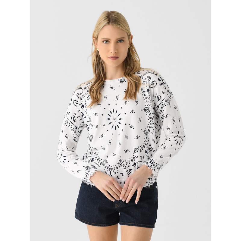 DESCRIPTION:This casual sweater is made from soft knit cotton and features distressed trims and a bandana print.FEATURES:Crew NecklineDropped ShoulderDistressed TrimsRibbed Neckline, Cuffs and HemAll-Over Novelty PrintKnit Fabrication100% CottonRelaxed Fit