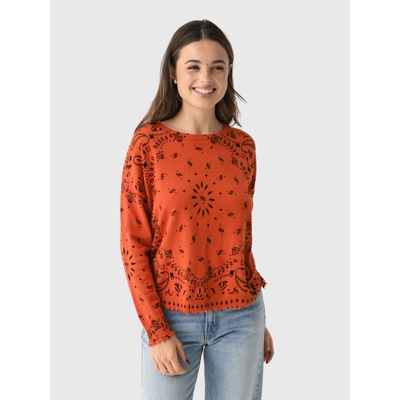 DESCRIPTION:Made from soft knit cotton, this casual sweater features distressed trims and a bold bandana print for a laid-back, lived-in look.FEATURES:Crew NecklineDropped ShoulderDistressed TrimsRibbed Neckline, Cuffs and HemAll-Over Novelty PrintKnit Fab